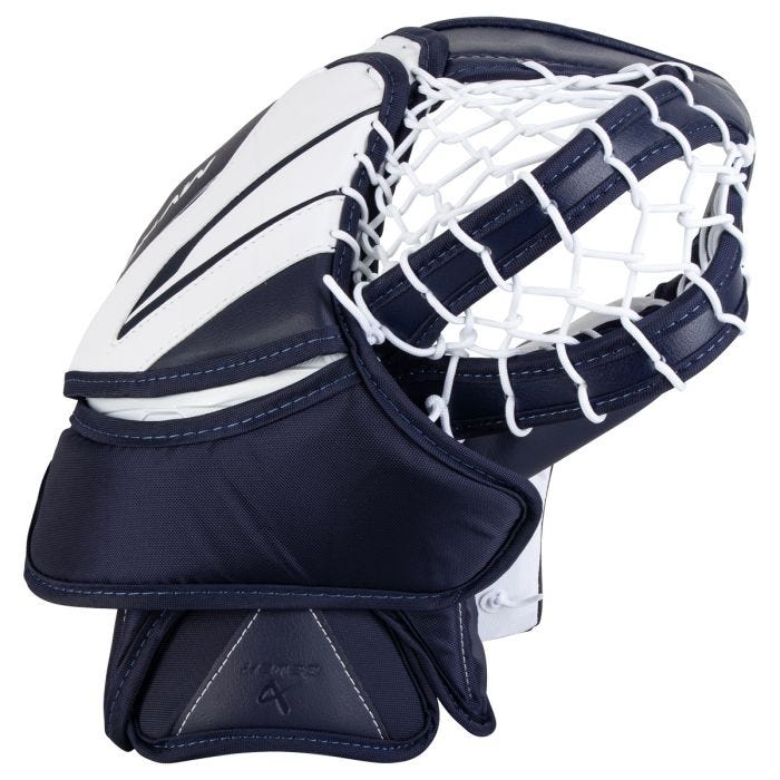 Регульована задня частина з відкритим ремінцем для зап’ястка: рукавичка Supreme MVPro закріплена за допомогою відкритого ремінця для зап’ястка, який легко потягнути, що дозволяє швидко регулювати положення на льоду. Він також має регульовану м’яку сітчасту задню частину для забезпечення належного захисту, не обмежуючи закриття рукавиці.
