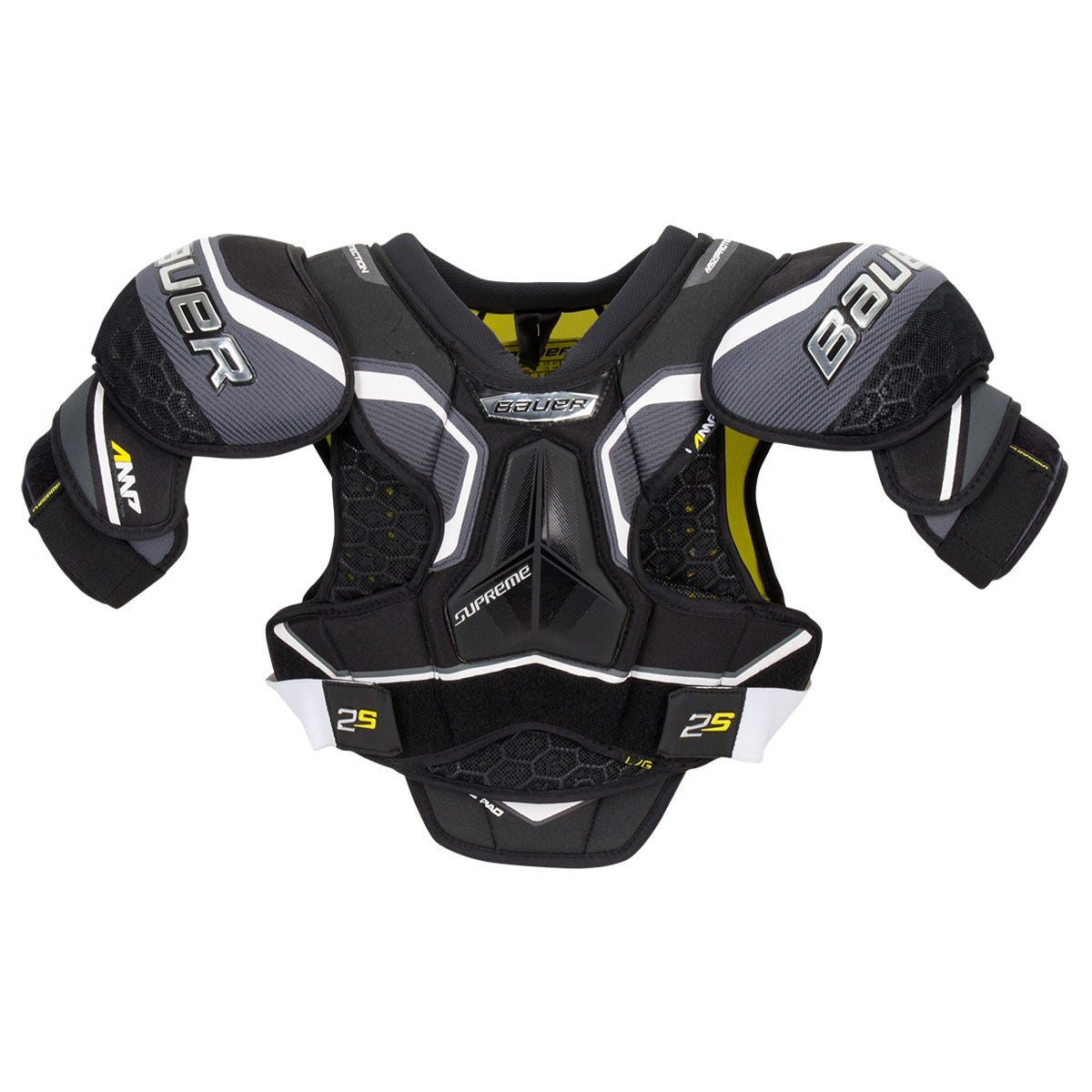 Нагрудник хокейний BAUER SUPREME 2S S19 JR юнацька модель напівпрофесійного рівня, новинка сезону 2019 року, має контурну посадку, яка відрізняється щільним приляганням захисту до тіла та дозволяє забезпечити ефективний захист та надає нагруднику відмінну мобільність. Фронтальна частина складається з трьох, рухомо з'єднаних між собою панелей, які кріпляться за допомогою еластичного нейлону для збільшення рухливості, в той час як захист грудини плаває зверху, забезпечуючи належний захист центру грудної клітини. Для створення надійного захисту центру грудини використовується щиток, виконаний із формованої піни високої щільності та пластикової вставки. Бічні панелі та елемент захисту живота виконані з легкої, перфорованої піни Vent Armor, яка забезпечує високий рівень захисту та кращу повітропроникність на ринку. Захист живота за потреби може бути видалено. Жорстка пластикова вставка анатомічної форми над ключицею доповнена піною високої густини. М'який, прокладений піною комір забезпечує зручне прилягання нагрудника в області шиї. Плечові суглоби закриваються низькопрофільними елементами анатомічної форми, які виробляються з формованого пластику та покриваються піною середньої щільності, створюючи комфортне прилягання до тіла. Доповнює захист плечових суглобів піни IX Foam. Захист біцепса має конструкцію AMP (Active Motion Protection) та розділений на 2 частини для розширеного діапазону руху, кращого охоплення та комфорту. Частини захисту біцепса між собою з'єднуються нейлоновою сіткою, що покращує вентиляцію та підвищує мобільність. Елементи захисту біцепса також можна регулювати по довжині, щоб повністю закрити проміжок між налокотниками та елементами захисту біцепса в нагруднику. Формований пластик анатомічної форми, який фанерований перфорованою піною та піною середньої щільності, закриває біцепс. Задня частина має цілісну конструкцію. У бічних панелях задньої частини використовується вентильована піна Vent Armor, тоді як формована піна високої щільності закриває хребет та ребра гравця. Внутрішня підкладка Thermo Max+ відмінно справляється з надлишками вологи, а також має бактерицидне просочення, яке запобігає появі бактерій, що викликають запах. Нагрудник фіксується еластичними ременями на липучці.