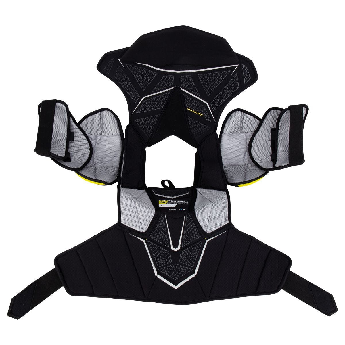 Наплічник хокейний BAUER SUPREME ULTRASONIC SR - флагманська модель в лінійці Supreme, новинка сезону 2021 року. Контурна посадка нагрудника створює стандартне покриття та робить нагрудник максимально мобільним. Передня панель має односкладову конструкцію з розширеним покриттям ребер та виконана зі стандартної піни. Плаваючий щиток, що закриває грудину, виконаний із щільної піни, яка доповнена матеріалом Adaptiv Skin, що створює ефективний захист від порізів та від ударів. При цьому щиток відповідає формі тіла гравця та формує низький профіль захисту, а також гарантує максимальну мобільність. Знімний захист черевної порожнини має розширену конструкцію та виконаний із стандартної піни. Плечові чаші виконані із застосуванням технології Active Motion Protection, яка дозволяє елементам захисту рухатися разом із гравцем, зберігаючи при цьому низький профіль. Захист плечових суглобів забезпечують матеріал Adaptiv Skin та піна Vent Armor. При цьому піна Vent Armor робить захист вентильованим та легким. Регульовані по довжині двокомпонентні елементи захисту біцепса виконані зі стандартної піни, яка посилена литим пластиком. Технологія Active Motion Protection, що використовується в конструкції захисту біцепса, робить елементи захисту мобільними і створює максимальне покриття та ефективний захист. Задня панель виконана із формованої піни високої щільності. Захист хребта виконаний з вентильованої піни Vent Armor і посилений пластиковою вставкою. Ключова область має захист, який виконаний із стандартної піни та пластикових вкладок. Внутрішня підкладка Thermo Core сприяє швидкому відведенню надлишків вологи від тіла гравця, робить захист швидко сохнучою, зберігаючи її легку вагу. Підкладка має бактерицидне просочення, яке пригнічує зростання бактерій, що викликають неприємні запахи, зберігаючи спорядження свіжим. Вага 943 грами (у розмірі Senior MD).