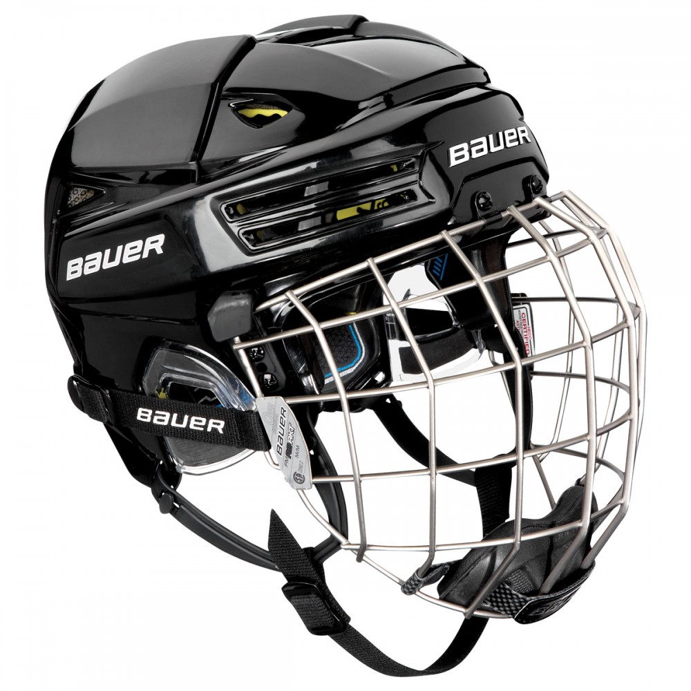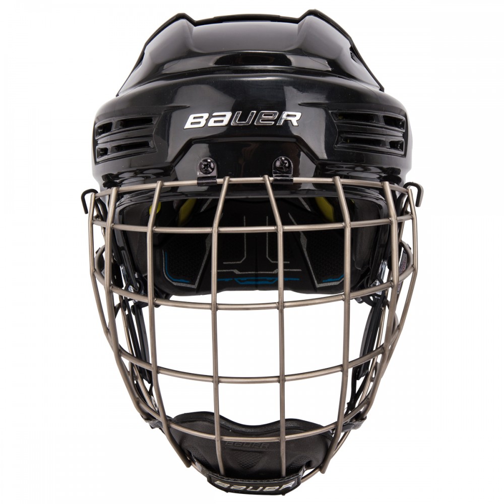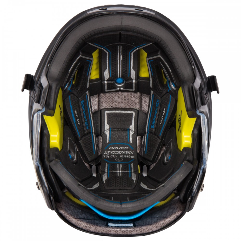 Шолом хокейний польового гравця BAUER RE-AKT 200 COMBO топова модель нового покоління сезону 2017 року є на сьогоднішній день найтехнологічнішою та забезпечує найвищий рівень захисту та безпеку на льоду. Як базовий шар, який контактує з полікарбонатним корпусом шолома, використовується удосконалена, формована піна VTX, що має знижену вагу і покращені захисні властивості. Формовані вкладки, розташовані у скроневій ділянці та виконані з піни Poron XRD з функцією пам'яті, забезпечують надійний захист від ударів, розсіюючи енергію та захищаючи голову від ударів по дотичній. Унікальним для даної моделі шолома є термоформований потиличний замок, виконаний за технологією FitPlate. Для створення індивідуальної посадки шолома потиличний замок FitPlate під впливом тепла та тиску набуває форми голови. Процедура термоформування може проводитися стільки разів, скільки необхідно. Вільно плаваючий багатошаровий вкладиш, виконаний з ексклюзивної піни NextGen Suspend-Tech, рухається незалежно від голови гравця, ефективно сповільнюючи обертальне прискорення при ударах. Завдяки новому потиличному замку цей вкладиш допомагає захистити голову від усіх видів ударних сил, забезпечуючи при цьому кращий комфорт. Додатковий амортизуючий прошарок, що контактує з головою гравця, виконаний з піни VN середньої щільності і забезпечує виключно комфортну посадку шолома на голові. Вологопоглинаюча прокладка, розташована в області чола, виключає попадання вологи в очі. Вентиляційні прорізи, розташовані в корпусі, збільшують приплив повітря у внутрішній простір, сприяючи швидкому відводу тепла та вологи. Просочення Microban, яким оброблені вкладки, що амортизують, пригнічує розвиток і зростання бактерій, що викликають неприємні запахи. Регулювання густини посадки шолома проводиться без використання інструментів. Шолом сертифікований HECC, CSA та сумісний з більшістю захисних, лицьових масок та візорів.