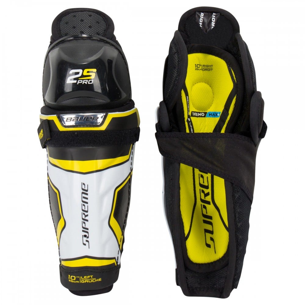 Щитки хокейні польового гравця BAUER SUPREME 2S PRO S19 YTH модель сезону 2019 створена для найменших гравців і забезпечує максимальний захист при мінімальній вазі. Щитки мають анатомічну посадку, яка передбачає близьке розташування елементів захисту до тіла гравця для досягнення максимальної ефективності захисту. Пластиковий корпус щитків має ребра жорсткості, що збільшують просторову жорсткість конструкції. Колінна чаша має глибоку, анатомічну посадку. З внутрішньої сторони корпусу колінної чаші розташована легка піна, яка забезпечує надійний захист від ударів. Навколо колінного суглоба розташовуються захисні елементи, виконані піни середньої щільності, у результаті створюється високий рівень захисту. Щитки мають інтегрований захист стегна із внутрішнім наповненням із піни середньої щільності. Захист литкового м'яза виконує елемент, в якому як амортизуюче наповнення використовується легка і добре вентильована піна Vent Armor. Внутрішня підкладка ThermoMax виконана із зносостійкої мікрофібри. Матеріал підкладки сприяє швидкому випаровуванню надлишків вологи, а також має хороші властивості, що дихають, створюючи тим самим комфортні умови. Для фіксації щитків використовують фіксуючі ремені, які забезпечують надійне утримання щитка на нозі.