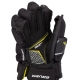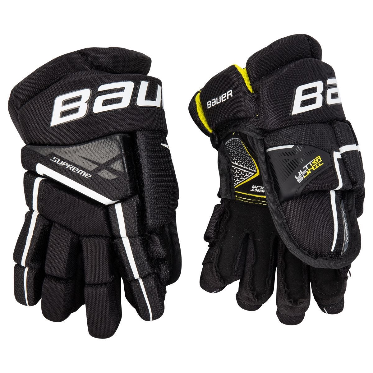 Рукавички хокейні BAUER SUPREME ULTRASONIC YTH створені для найменших гравців, вони відрізняються легкою конструкцією та надійним захистом, а також дають гравцям відмінне володіння ключкою, зберігаючи при цьому високу зносостійкість. Рукавички з контурною посадкою відрізняються щільним приляганням у ділянці пальців, тильній частині та в манжеті. Матеріалом зовнішнього оздоблення є трикотажний поліестер, що відрізняється високою зносостійкістю. Захист пальців має двосегментовану будову і виконаний із щільної, стандартної піни, яка також використовується і в захисті тильної частини кисті. Цілісний, формований великий палець запобігає надмірному розтягуванню великого пальця при падінні або при контакті з іншим гравцем. Захист великого пальця виконаний із стандартної піни, яка посилена цільною, формованою, пластиковою вкладкою. У манжеті як внутрішній набивання використовується стандартна піна. Матеріалом долонної частини є синтетичний матеріал Connekt+, який відрізняється м'якістю та міцністю, і дає гравцеві відмінну чутливість та впевнене зчеплення при роботі з ключкою. Додаткова накладка із чорної мікрозамші посилює долоню і робить її більш зносостійкою. Вставки між пальцями виконані із еластичного поліестеру. Внутрішня підкладка Thermo Max чудово справляється з надлишками вологи та швидко висихає. Вага 107 грам (у розмірі 9 дюймів).