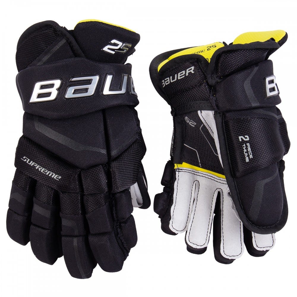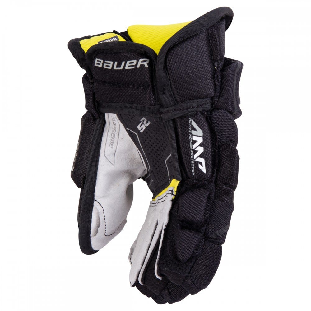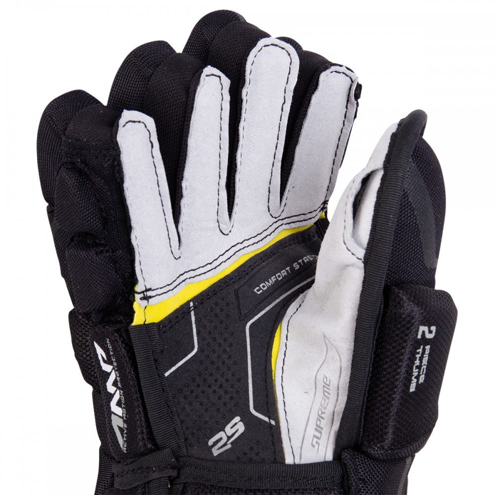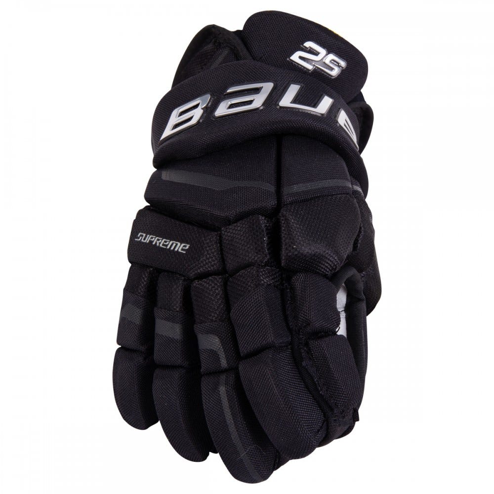 Рукавички хокейні BAUER SUPREME 2S S19 JR юнацька модель напівпрофесійного рівня, новинка сезону 2019 року має контурну посадку з елементами захисту, що близько розташовані до руки. Зовнішня обробка рукавичок виконана з міцного нейлону та плетеної сітки, що робить рукавички міцними, гнучкими та добре вентильованими. Як захист на тильній стороні рукавичок і сегментованих елементах, що закривають пальці, використовується піна подвійної щільності і пластикові вкладки, які посилюють захист. Товстий шар піни середньої густини використовується в манжеті. Захист великого пальця складається з двох частин і має конструкцію Free Flex, яка збільшує гнучкість великого пальця і одночасно захищає його від вивихів. Вказівний палець, розрізаний на три захисні сегменти, має відмінну рухливість. Інші пальці розрізані на два захисні сегменти. Манжета має конструкцію AMP (Active Motion Protection), в якій використовується матеріал з еластичної лайкри, який з'єднує манжету з корпусом для максимальної рухливості зап'ястя, зберігаючи захист на місці. Долоня рукавичок виконана із синтетичної замші AX Suede Quattro Pro з еластичними вставками, в результаті забезпечується відмінне зчеплення з ключкою та висока стійкість до стирання. В області пальців розташований м'який матеріал Hyper Sense Finger Liner, який чудово поєднується з еластичними вставками між пальцями, забезпечуючи максимальну рухливість і комфорт. Усередині використовується вкладиш Thermo Max+, який відмінно справляється з надлишками вологи, а також має бактерицидне просочення, що запобігає появі бактерій, що викликають запах.