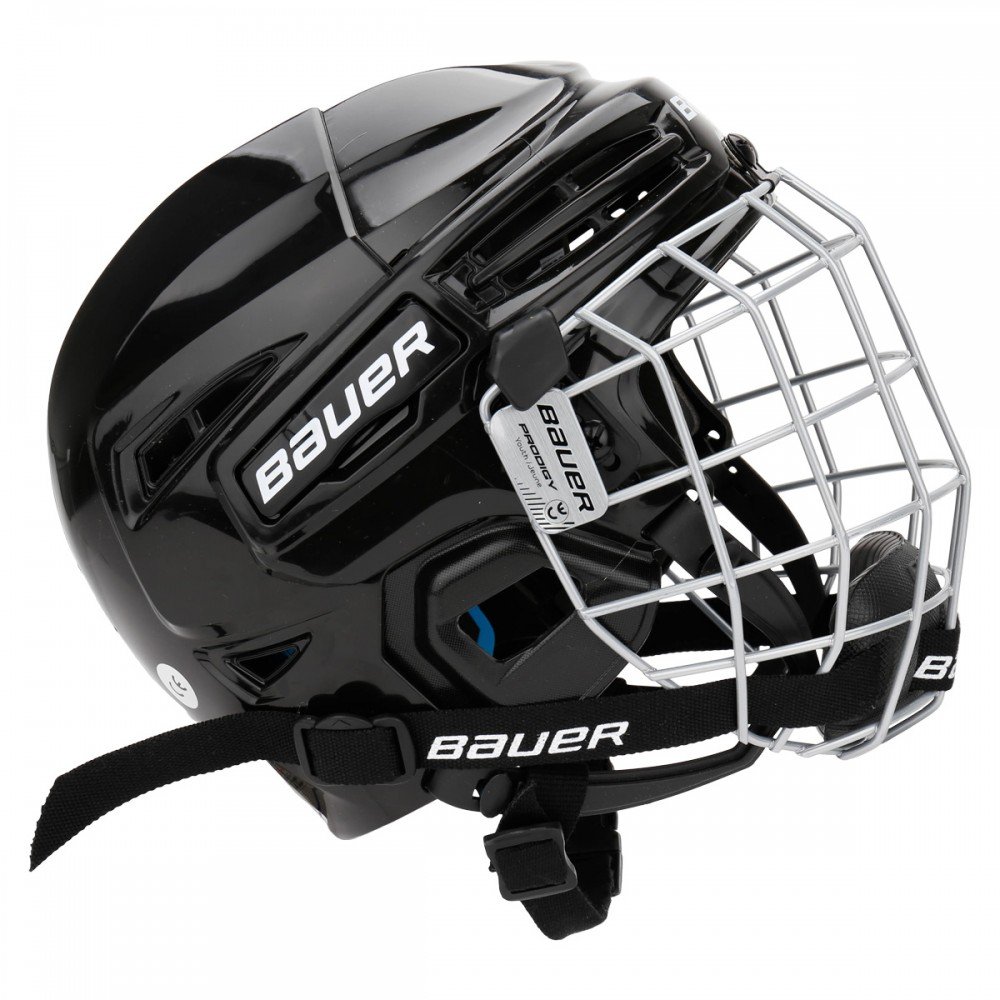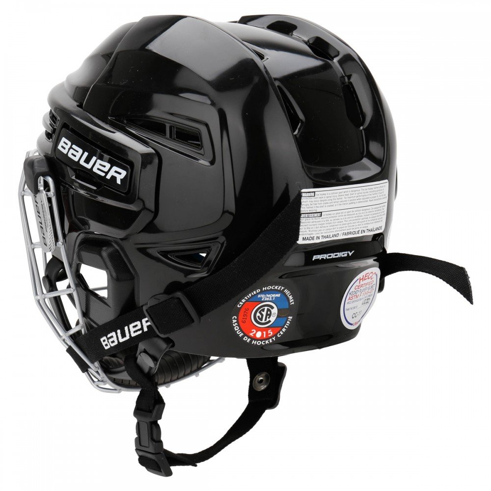 Комбінований хокейний шолом Bauer Prodigy Youth Hockey Helmet складається з піни подвійної щільності, корони з подвійним хребтом і маски для обличчя Bauer PRODIGY. Цей шолом також має сертифікати CSA, HECC, CE з регулюванням без інструментів і чотирипозиційними J-Clips, а також регульованими верхніми затискачами для індивідуальної посадки.