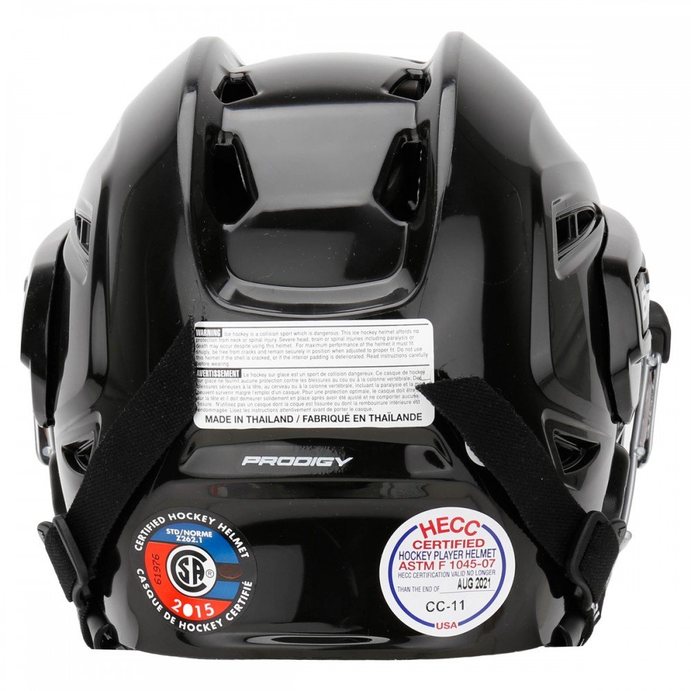 Піна подвійної щільності оптимізована для молодіжних ігор. Двогребенева коронка. Сертифіковано CSA, HECC, CE. Регульована оболонка з двох частин. Регулювання без інструментівШолом PRODIGY і маска PRODIGY. Чотирипозиційні J-Clips і регульовані верхні затискачі. Застібки для швидкознімної маски. Сертифіковано CSA, HECC, CE.